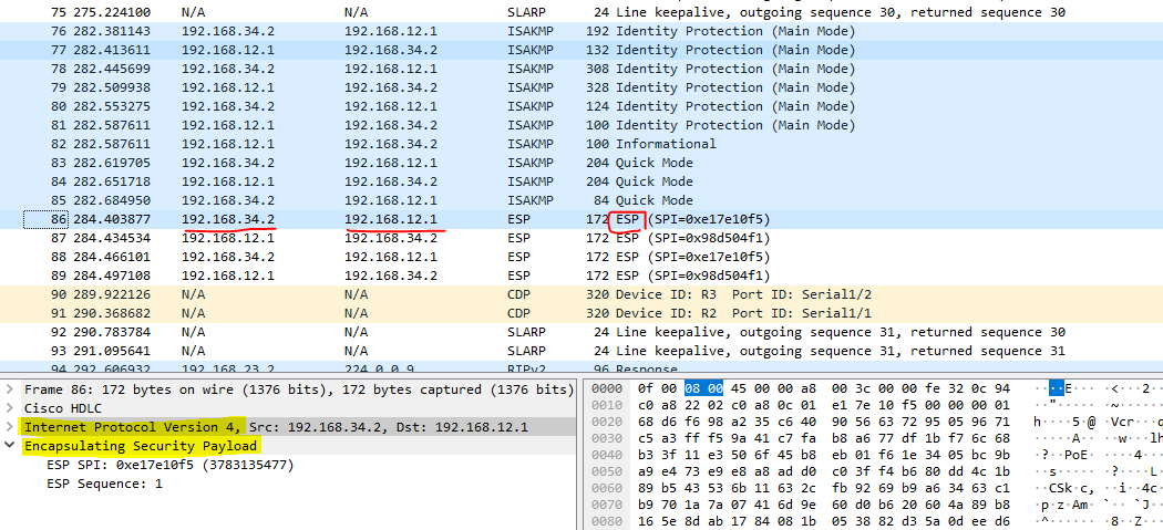 - ESP (패킷 전송 부분) 클릭하면 "Encapsulating Security Payload" 밑으로 Sequence 번호, SPI 번호만 알 수 있고, Original Header IP 값은 암호화 + 캡슐화 되어서 ESP 안으로 더이상 진입 불가