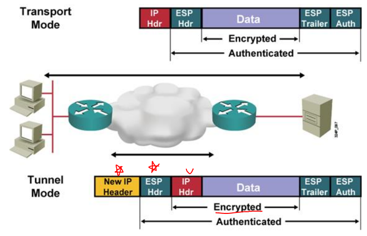 - Encapsulating Security Payload : Original IP Header 값을 담고있음 (값 자체는 암호화 + 캡슐화되어서 볼 수 없음)
