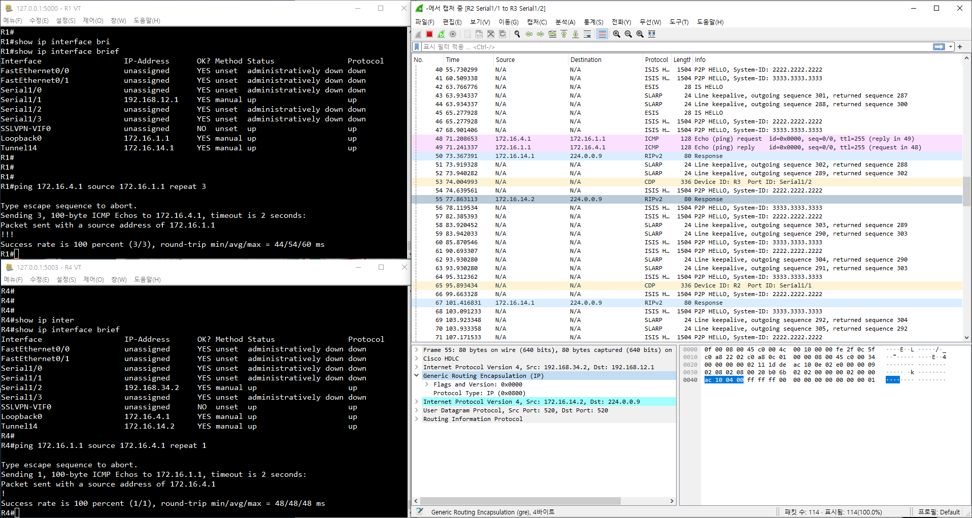 - 물리적인 GRE Tunnel 을 통해서 두 라우터간 직접 통신하듯이 구성할 수 있음 (R1, R4 두 개의 라우터만 있으면 됨)