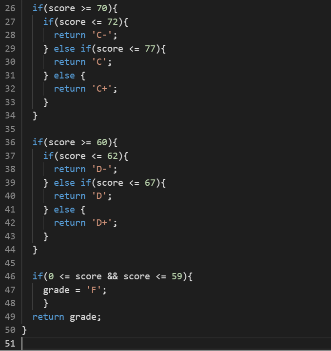 function "convertScoreToGradeWithPlusAndMinus" // 점수 범위에 알맞는 등급을 문자열로 반환함