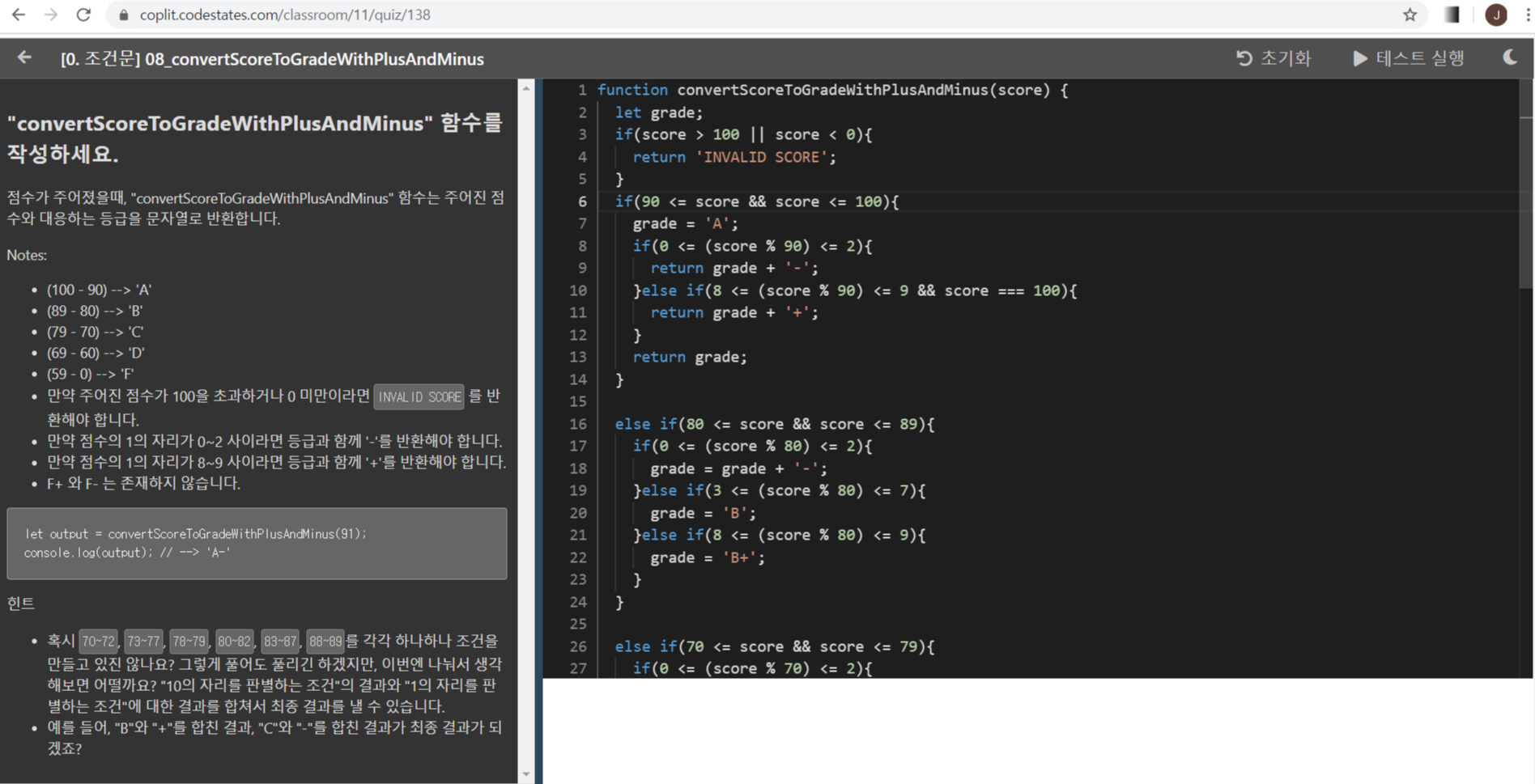 왼쪽에는 문제가 주어져있고, 오른쪽에는 내가 원하는 대로 작성할 수 있는 코드란이 주어진다. 각 점수대 별로 grade를 주는 것은 해결했는데, +를 주는 것에서 막혔다. 분명 똑바로 한 것 같은데 왜 안 풀리는지 모르겠지만 더 노력해봐야겠다.
