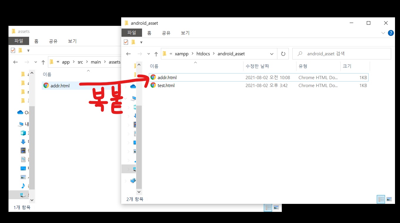 *그냥 html 파일 클릭 > Ctrl+c > android_asset파일 클릭 > Ctrl+v 하면 복붙된다.