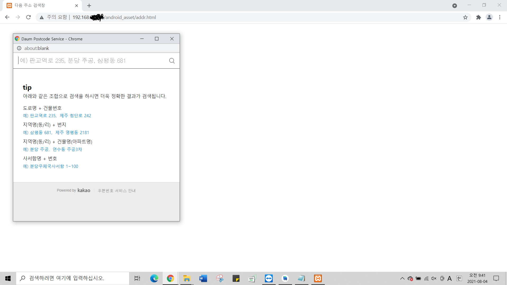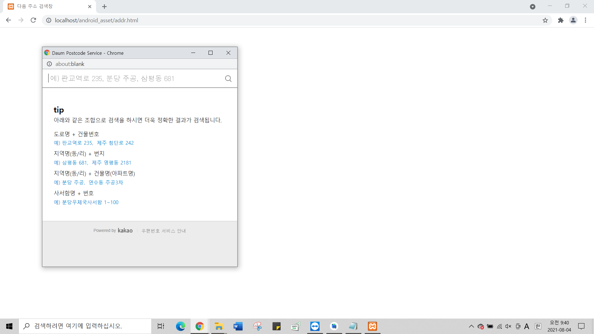 ii) 인터넷 창을 열어서 도메인 주소창에 입력 : localhost/android_asset/addr.html