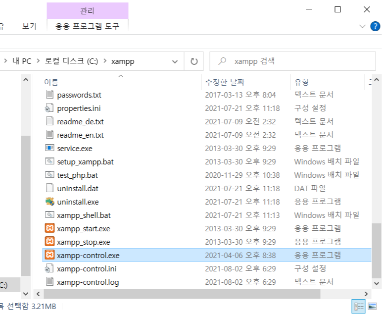 그러면 xampp 폴더 안에 있는 실행파일 xampp-control.exe 을 관리자 권한으로 실행시켜보자 (우클릭 > "관리자 권한으로 실행")