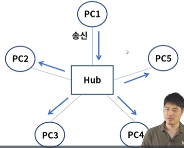 - 단순 중계기 역할로, 허브에 연결된 PC1 이 다른 PC2에게 데이터를 보내려면 허브에 연결된 모든 PC들에게 그 데이터를 전달하게 됨