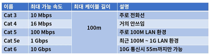 - 종류 : TP(Twisted Pair), 동축, Fiber(광)